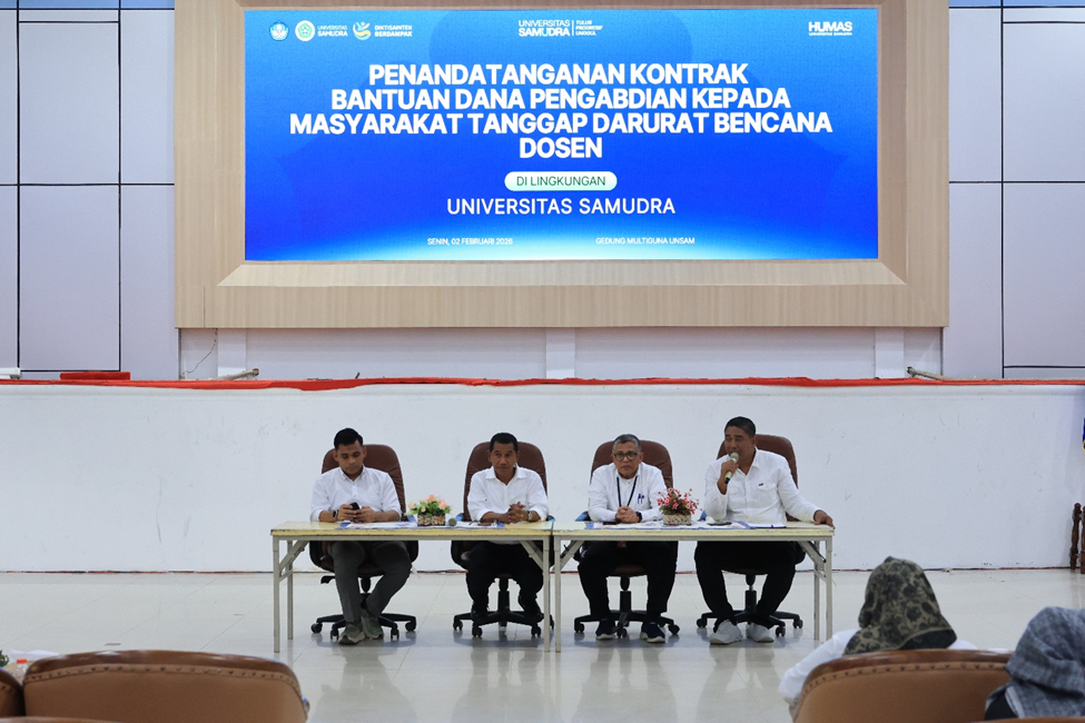 Langsa, 3 Februari 2026 – Universitas Samudra (Unsam) melaksanakan penandatanganan kontrak bantuan dana hibah pengabdian kepada masyarakat sebagai tindak lanjut program tanggap darurat bencana. Program ini ditujukan bagi dosen di lingkungan Unsam dengan total 251 proposal yang didanai. Kegiatan penandatanganan kontrak dilaksanakan di Gedung Multiguna Unsam pada Senin, (2/2/2026).