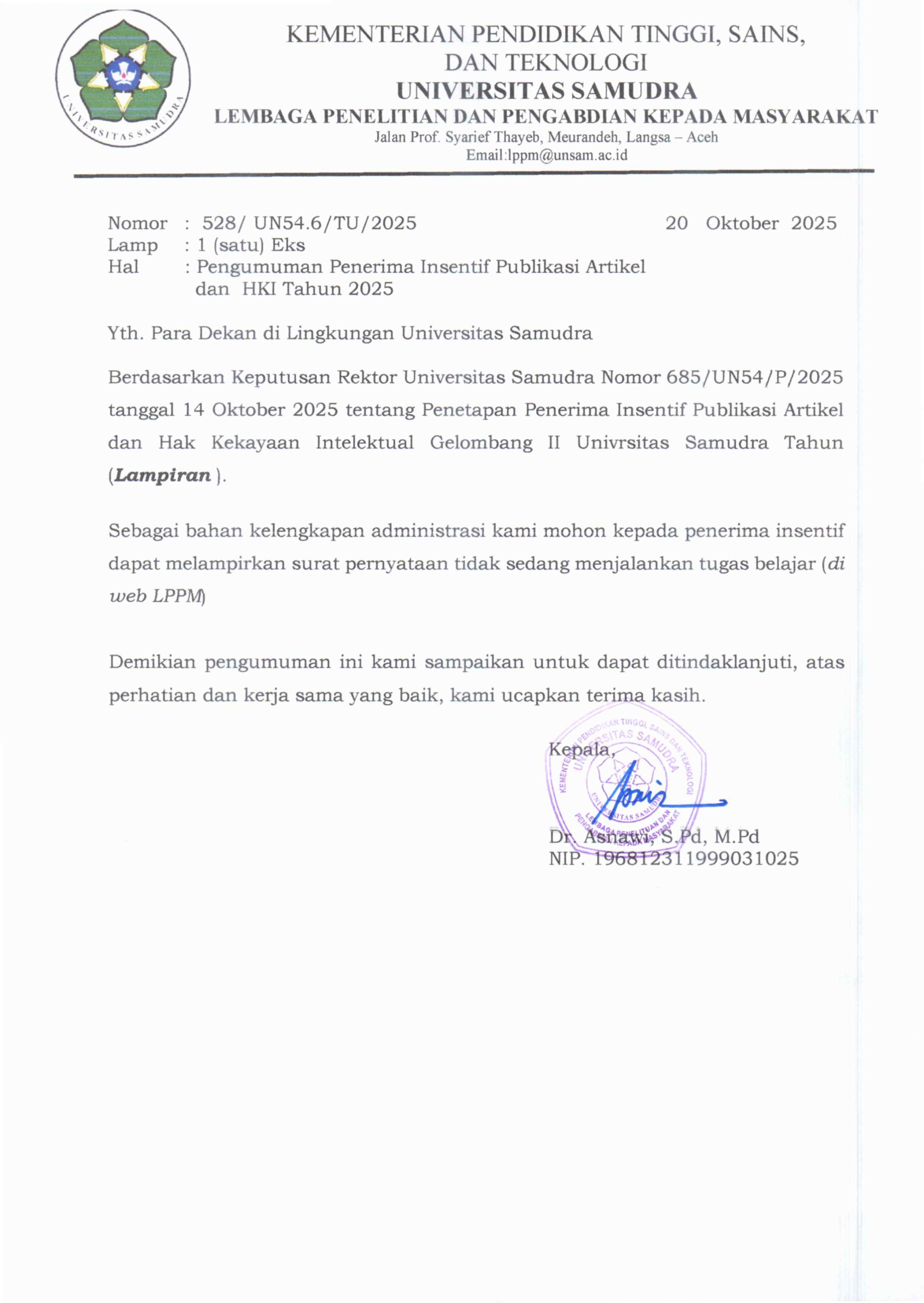 Pengumuman Penerima Intensif Publikasi Artikel dan HKI Tahun 2025By Humas LPPM / October 20, 2025 Buka Pengumuman Surat Pernyataan Tidak Sedang Menjalankan Tugas Belajar
