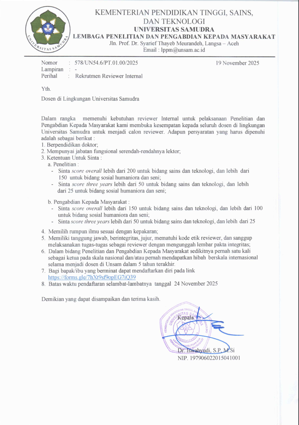 Rekrutmen Reviewer Internal Tahun 2026By Humas LPPM / November 19, 2025 Klik surat di atas untuk selengkapnya.